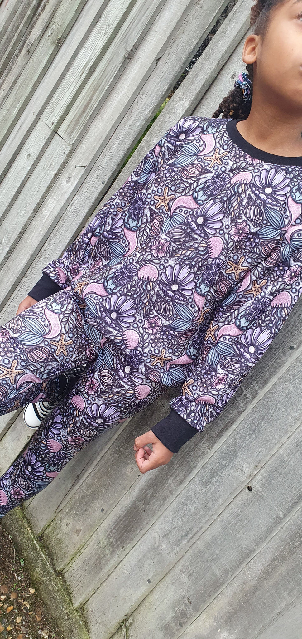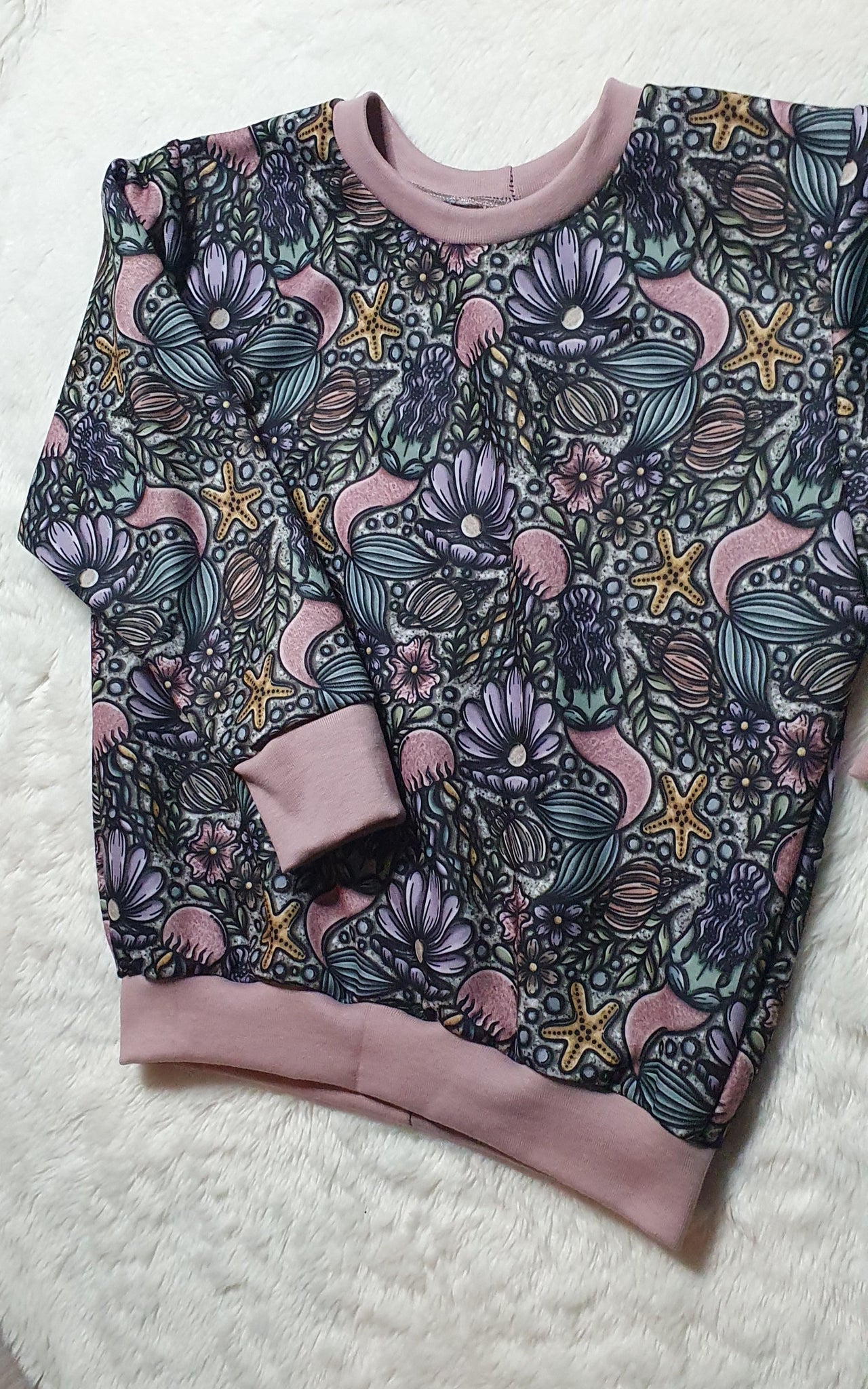 Lounge style jumper, matching dusky pink plain cuffs and trims.
